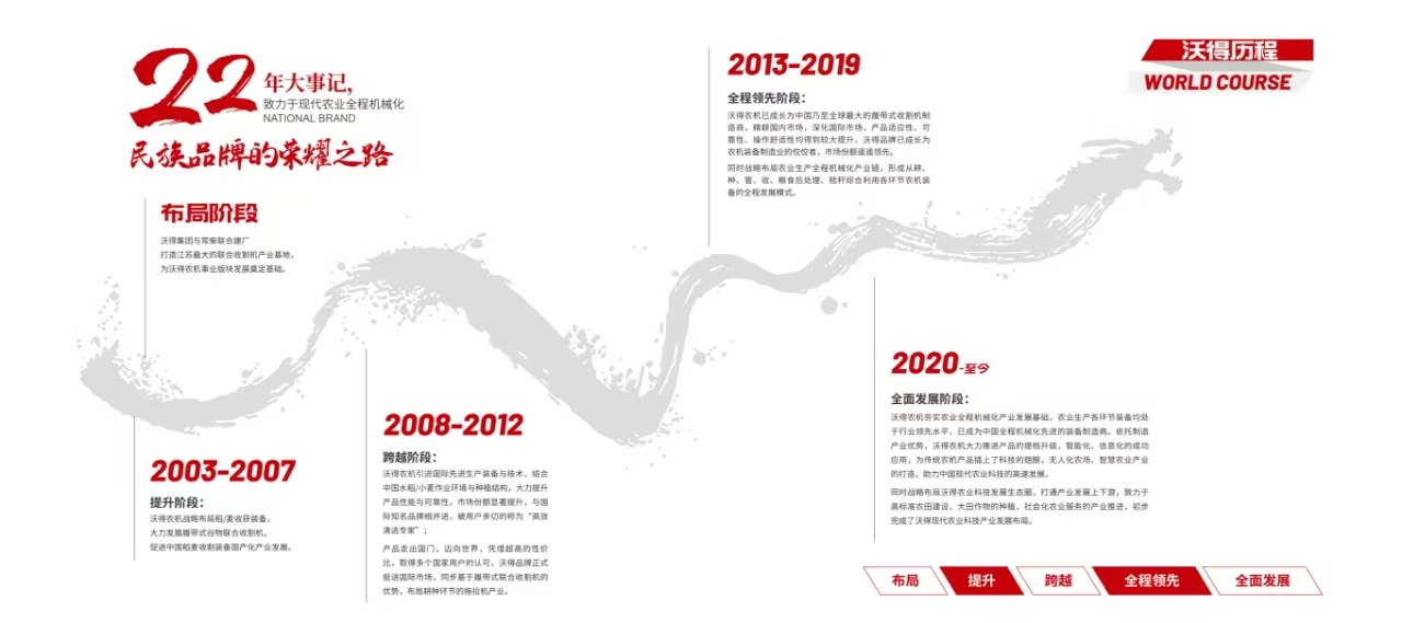 沃得農(nóng)機隸屬于中國民營企業(yè)500強之一的江蘇沃得集團,占地面積3000余畝,員工8000余人,2016年實現(xiàn)銷售70億元人民幣,是一家集研發(fā)、生產(chǎn)、銷售、服務(wù)于一體的大型現(xiàn)代化農(nóng)機裝備制造企業(yè)。沃得農(nóng)機立足水田,致力于現(xiàn)代農(nóng)業(yè)全程機械化,歷經(jīng)近30年發(fā)展,產(chǎn)品形成以耕-種-田間管理-收獲-秸稈綜合利用-糧食后處理全系列產(chǎn)品線。依托優(yōu)質(zhì)的產(chǎn)品和誠信的服務(wù),公司產(chǎn)品暢銷全國28個省市自治區(qū),出口至世界38個國家和地區(qū)。